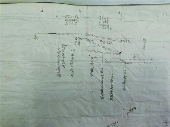 白家墕地洞打得较好。在今年一月份敌人大扫荡的那次,老百姓四处逃跑,这使得老百姓有的逃到河西,有的跑到敌占区附近,有些老百姓和民兵不愿意跑,即藏该村旧地洞中。一月七日,敌就来这个地洞内,老百姓把锹镢头一齐举动,乱砍乱响,叫喊声很高,敌人在外面就说:“这里有机关枪,八路军,不敢过去。”敌人走了老百姓就商量,今后要在这就得把地洞修理一下,回来商量就开始了。在十二丈高崖的半山中间,开着洞口先往地下打,六七丈高,然后开口,开口一丈多深,就向上打了二丈深的胡萝卜窑洞则,然后一面平平向后。打了十二丈,旁边打了横窖则八个,向外打出两个口子,一为枪眼,亦顶气眼。一为厕所,又顶个枪眼,高四尺五丈,这个工程还不大,每天四个工,共打了卅二天,合计为一百八十个工。