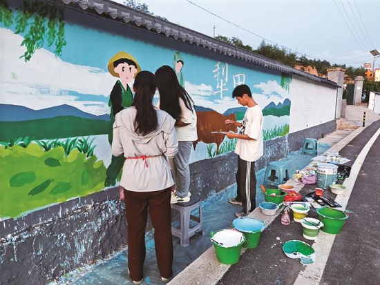 图为太原理工大学社会实践团在石楼县罗村绘制2000米彩绘。